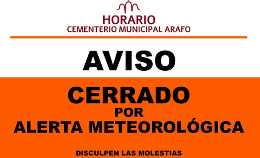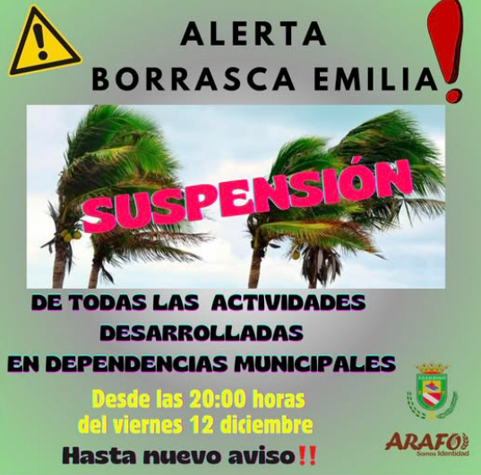 Arafo, a 12 de diciembre de 2025.- Debido a la declaraciรณn de la situaciรณn de ๐จ๐ณ๐ฌ๐น๐ป๐จ por ๐๐๐๐๐๐๐ y FENรMENOS ๐พ๐๐๐๐๐๐๐ y por la situaciรณn de ๐๐๐-๐ผ๐๐๐๐๐ผ por ๐๐๐จ๐ฉ๐๐๐ฆ, y ante una posible evoluciรณn de los fenรณmenos atmosfรฉricos adversos, EL AYUNTAMIENTO DE ARAFO, por cuestiones de seguridad, PROCEDE AL ๐๐๐๐ฅ๐ฅ๐ DE: