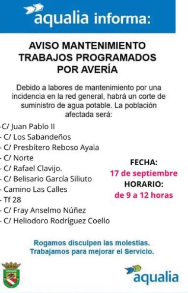 Aqualia nos informa que mañana miércoles 17 de septiembre, en horario aproximado de 9 horas de la mañana a 12 horas del mediodía por obras de mantenimiento de la red en la C/ Rafael Clavijo se producirá un corte del suministro de agua en las siguientes calles: