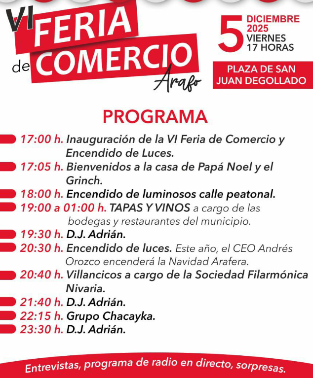 Arafo, a 27 de noviembre de 2025.- El espíritu navideño llega a Arafo cargado de magia, compras y diversión para toda la familia. El próximo 5 de diciembre, la plaza de San Juan Degollado se convertirá en el epicentro de la ilusión con la celebración de la VI Feria de Comercio y el Encendido de Luces de Navidad.