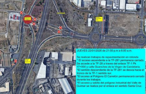 El Cabildo Insular de Tenerife, área de carreteras, informa que, por los trabajos que se realizan en el ámbito de las obras de mejora de la accesibilidad al municipio de Arafo y al Polígono Industrial Valle de Güímar, hoy jueves 22 de enero, desde las 21:00 horas hasta las 6:00 horas, de mañana viernes 23 de enero, se cerrará completamente el tramo de la carretera TF-281 y la rotonda del Carretón desde la zona del Volcán.