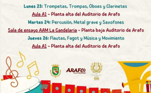 Las actuaciones tendrán lugar los días 23, 24 y 26 de marzo de 2026, a partir de las 17:30 horas, en el Aula A1 y la Sala de Ensayo de la AAM La Candelaria, situadas en el Aulario del Auditorio de Arafo.