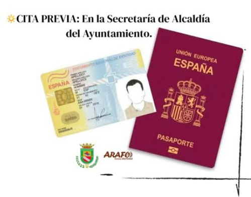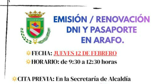 El Ayuntamiento de Arafo informa que el próximo JUEVES 12 DE FEBRERO, se desplazará al municipio el Equipo de DNI Rural de la Policía Nacional para la expedición de DNIs y Pasaportes.