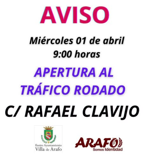 Arafo, a 1 de abril de 2026.- El Ayuntamiento de Arafó ha anunciado la reapertura al tráfico rodado de la calle Rafael Clavijo, una vez concluidas las obras de reparación de los desperfectos causados por la borrasca Therese. La vía volverá a estar operativa a partir de mañana, miércoles 1 de abril, con el restablecimiento también del servicio de transporte público.