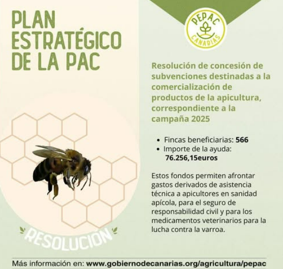 La Consejería de Agricultura, Ganadería, Pesca y Soberanía Alimentaria del Gobierno de Canarias ha publicado la resolución por la que se conceden las subvenciones destinadas a la mejora de la producción y comercialización de los productos de la apicultura en Canarias previstas en el Real Decreto que regula la Intervención Sectorial Apícola en el marco del Plan Estratégico de la Política Agrícola Común (PEPAC)