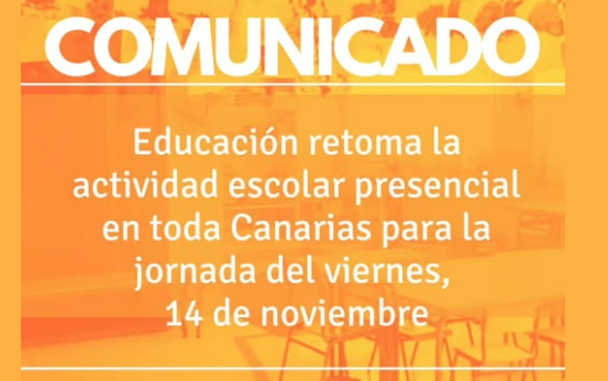La Consejería de Educación, Formación Profesional, Actividad Física y Deportes del Gobierno de Canarias, siguiendo las indicaciones de la Dirección General de Emergencias y Protección Civil sobre la evolución del episodio meteorológico que ha afectado estos días a nuestro archipiélago, informa de que este viernes, 14 de noviembre, se retoma la actividad lectiva presencial con normalidad en todos los centros educativos de todas las islas.