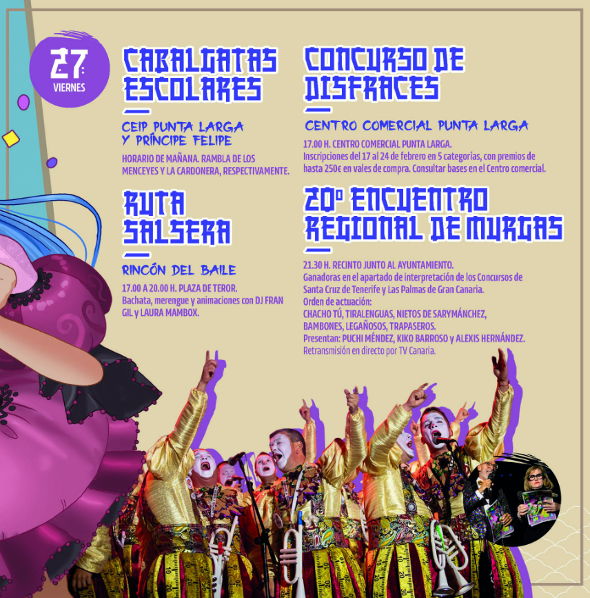 El viernes 27 será el turno de la comunidad educativa, con las cabalgatas escolares de los colegios de Punta Larga y Príncipe Felipe, además de un Taller de Bailes Latinos en la Plaza de Teror. Esa misma jornada tendrá lugar uno de los momentos más esperados: el 20º Encuentro Regional de Murgas, con la participación de los ganadores de los concursos de Santa Cruz de Tenerife y Las Palmas de Gran Canaria, que se emitirá en directo por Televisión Canaria.