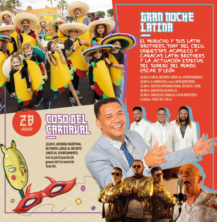 El sábado 28 de febrero llegará el Coso del Carnaval, que recorrerá la Avenida Marítima hasta el recinto junto al Ayuntamiento. A continuación, el público podrá disfrutar de la Gran Noche Latina, con las orquestas Caracas, El Morocho Latin Brothers y Acapulco, además de la actuación especial de Óscar D’León.