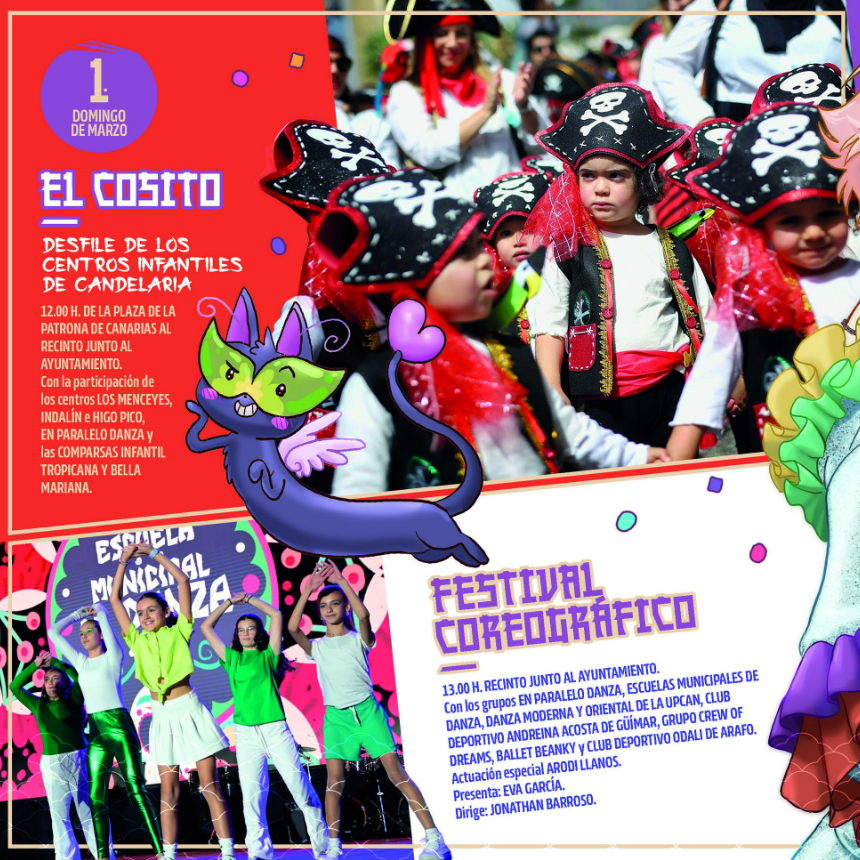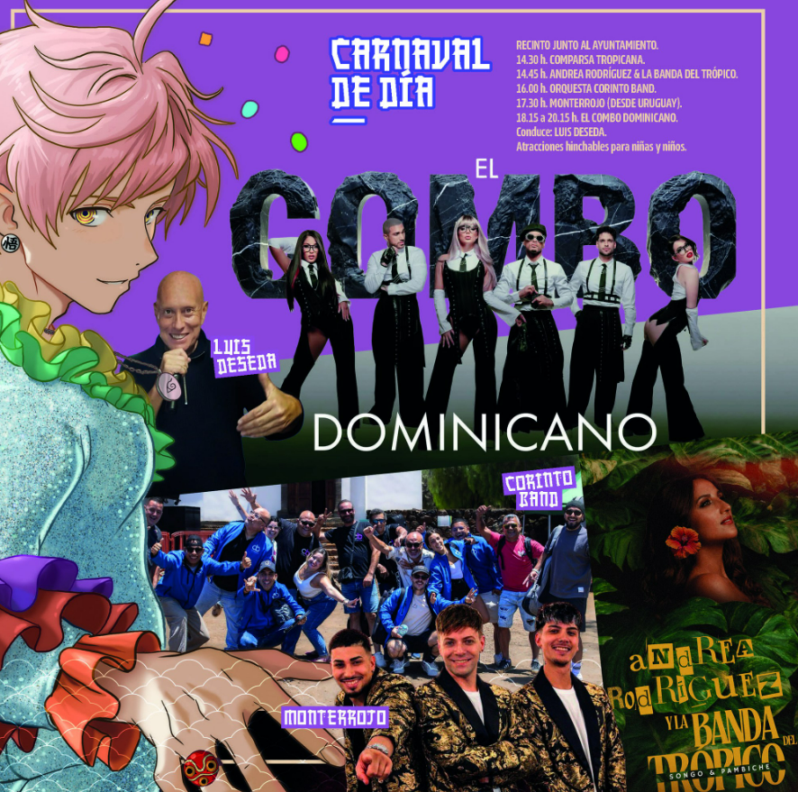 El domingo 1 de marzo será jornada grande desde por la mañana con el Cosito, protagonizado por los centros infantiles del municipio, seguido del Festival Coreográfico y el Carnaval de Día, con actuaciones de Tropicana y Bella Mariana, Andrea González & Banda del Trópico, Orquesta Corinto Band, Monterrojo (Uruguay) y Combo Dominicano, además de atracciones hinchables para los más pequeños. El cierre llegará con la quema de la sardina y el fin de fiesta con la orquesta Nueva Línea.