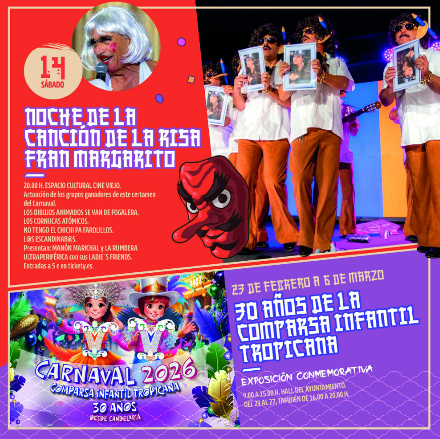Además, del 23 de febrero al 6 de marzo, el hall del Ayuntamiento acogerá la exposición conmemorativa “30 años de la Comparsa Infantil Tropicana”.