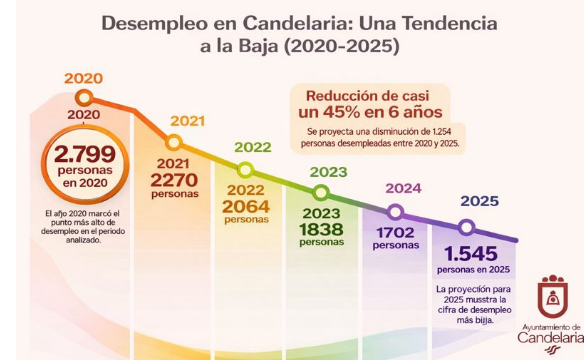 El municipio de Candelaria continúa avanzando de forma sostenida en la mejora del empleo. Los datos oficiales de desempleo reflejan una bajada constante desde diciembre de 2020 hasta diciembre de 2025, pasando de 2.799 personas desempleadas a 1.545, lo que supone un descenso del 44% en los últimos cinco años. La evolución anual confirma una tendencia clara y continuada a la baja, con 2.270 personas desempleadas en 2021, 2.064 en 2022, 1.838 en 2023 y 1.702 en 2024, hasta alcanzar la cifra actual.