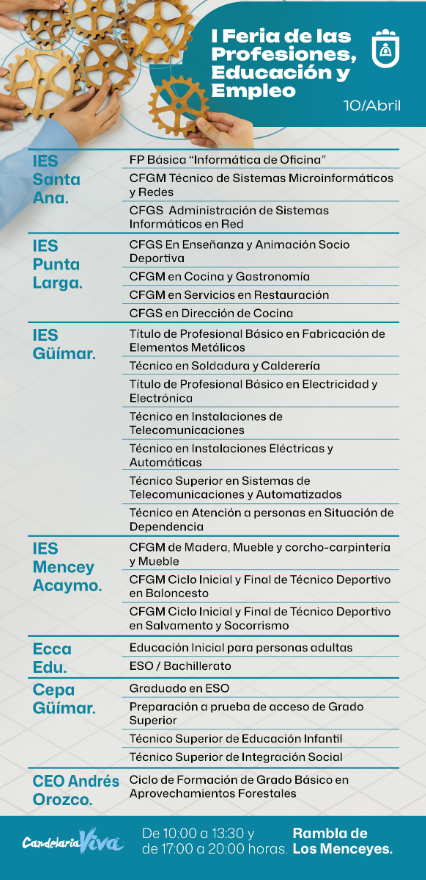 La feria contará con la participación de institutos y centros de enseñanza de Candelaria y municipios cercanos, que expondrán sus ciclos formativos de Grado Básico, Grado Medio y Grado Superior, así como opciones de educación para adultos.