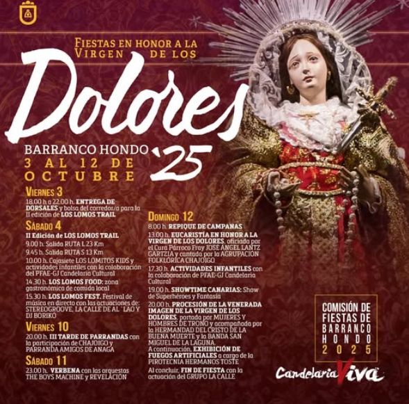 Candelaria, a 03 de septiembre de 2025.- Este fin de semana, Barranco Hondo se viste de gala para celebrar sus fiestas en honor a la Virgen de Los Dolores, una tradición que aúna devoción, deporte y convivencia vecinal. Las actividades comenzaron con la emocionante segunda edición del Los Lomos Trail, que congregó a más de 500 corredores, y se extenderán hasta el próximo 12 de octubre con un completo programa de actos .