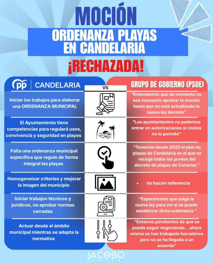 Según López, la propuesta del grupo popular no buscaba “aprobarla de inmediato”, sino simplemente “empezar a trabajar” en un marco normativo que regule de forma clara “el uso, la convivencia y la seguridad” en el litoral candelariero. “No pedíamos aprobar normas cerradas. Solo empezar a trabajar. Pero la moción fue rechazada”, afirmó el portavoz.