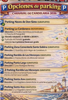 Candelaria, a 25 de febrero de 2026.- El municipio se prepara para celebrar el Carnaval con un amplio dispositivo que incluye restricciones de estacionamiento y circulación durante varios días. Se habilitan aparcamientos gratuitos y se recomienda máxima atención a la señalización provisional.