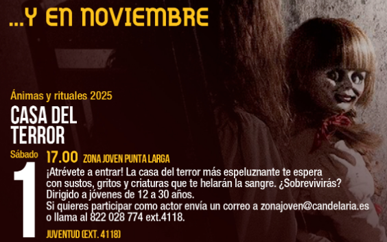 La tarde del próximo sábado, 1 de noviembre, promete emociones fuertes en Candelaria. A partir de las 17.00 horas, la Zona Joven de Punta Larga abrirá las puertas de una Casa del Terror especialmente creada para celebrar Finados dentro del programa municipal Ánimas y Rituales 2025.