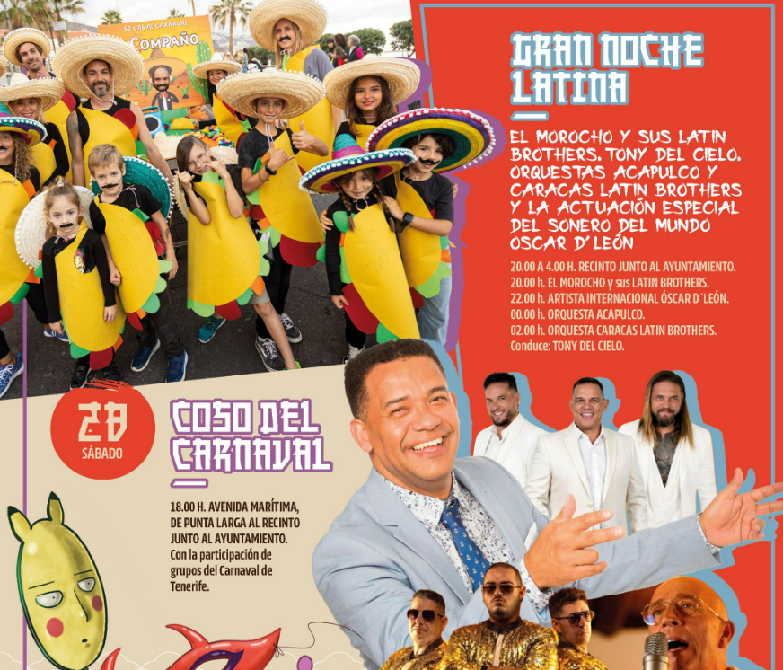 Candelaria, a 28 de febrero de 2026.- La Villa Marinera de Candelaria se prepara para vivir una jornada histórica dentro de su carnaval. Este sábado, 28 de febrero, la música y el color tomarán las calles desde la tarde con una programación que promete hacer bailar a miles de personas hasta altas horas de la madrugada. El plato fuerte de la noche será, sin duda, la actuación estelar del legendario «Sonero del Mundo», el venezolano Oscar D’León.