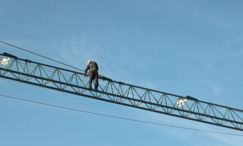 Candelaria, a 09 de octubre de 2025.- A la vista de la imagen, existe una situación de posible riesgo laboral relacionada con una grúa en construcción en el núcleo de Las Caletillas, Candelaria. Aunque las obras fueron denunciadas, se observó a un operario realizando una inspección.