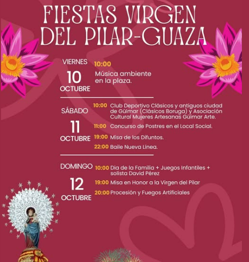 Las Fiestas del Pilar en Guaza son una celebración tradicional en honor a la Virgen del Pilar que combina actos religiosos, culturales y festivos en un ambiente de comunidad y devoción. Estas fiestas tienen raíces profundas en la historia de Guaza, siendo una de las celebraciones más importantes del pueblo que refleja su identidad cultural y religiosa.