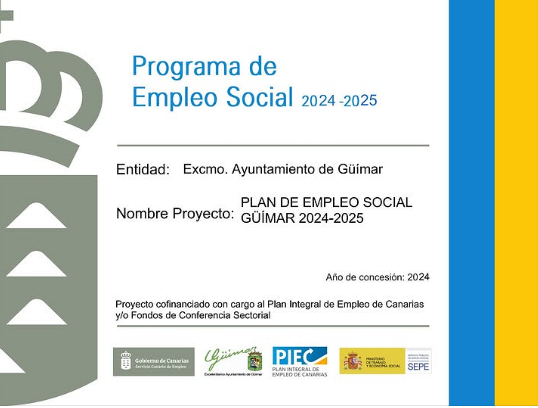 El pasado mes de diciembre de 2025 finalizó el Proyecto denominado “PLAN DE EMPLEO SOCIAL GÜÍMAR 2024-2025”, perteneciente a la convocatoria del Servicio Canario de Empleo de Subvenciones dentro del Acuerdo Marco de Colaboración entre el Servicio Canario de Empleo (SCE) y la Federación Canaria de Municipios (FECAM) para el desarrollo de tareas de utilidad y de reinserción social en el marco del Programa de Empleo Social (PES) para el período 2024-2025, financiado con fondos del Plan Integral de Empleo de CANARIAS 2024 (PIEC 2024) así como con fondos de Conferencia Sectorial.