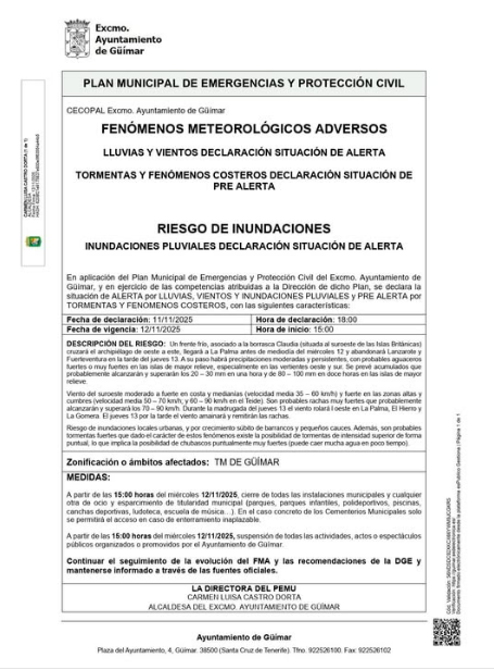 El Ayuntamiento de Güímar informa de la activación del Plan Municipal de Emergencias (PEMU) ante la evolución de la borrasca Claudia, que mantiene declaradas las situaciones de alerta por lluvias, vientos e inundaciones pluviales, así como de prealerta por fenómenos costeros y tormentas, a partir de las 15:00 h del miércoles 12 de noviembre.