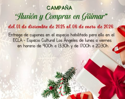 El Ayuntamiento de Güímar, a través de la Concejalía de Comercio, pone en marcha una nueva edición de la campaña “Ilusión y Compras en Güímar”, una iniciativa destinada a dinamizar la actividad comercial del municipio durante el periodo navideño y a premiar la fidelidad de los clientes de los comercios locales.