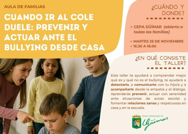 Güímar, a 19 de noviembre de 2025.- El Ayuntamiento de Guimar ha organizado una jornada de concienciación dirigida a las familias para abordar un tema de urgente actualidad: el acoso escolar o bullying. La cita será el próximo martes, 25 de noviembre, en el edificio de la Biblioteca Municipal, con el objetivo principal de dotar a las familias de herramientas para entender y combatir este fenómeno.