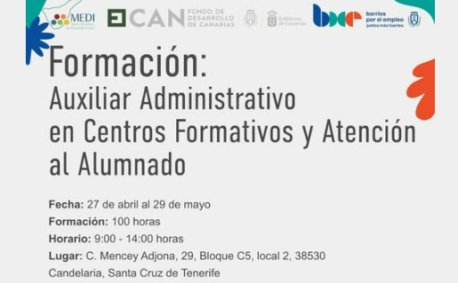 Candelaria, a 19 de abril de 2026.- Aún quedan plazas disponibles para el curso «Auxiliar Administrativo en Centros Formativos y Atención al Alumnado», una formación de 100 horas que se impartirá en Candelaria del 27 de abril al 29 de mayo. El perfil es muy demandado: profesionales capaces de gestionar la administración de centros de formación y atender al alumnado con solvencia y cercanía.