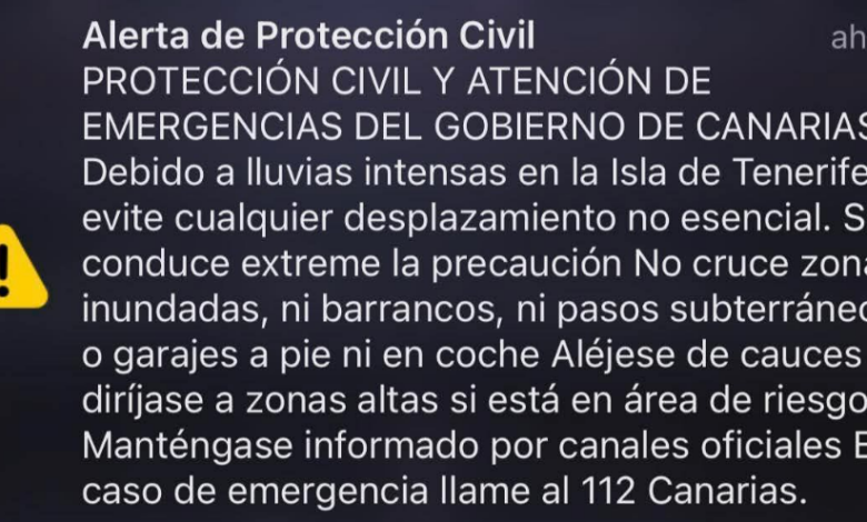 El envío de este tipo de mensajes a los teléfonos móviles (tecnología cell broadcast) se activa únicamente en situaciones de alto riesgo para llegar a toda la población de forma inmediata, sin necesidad de estar registrado en ningún servicio. La decisión se ha tomado ante la evolución del temporal que afecta al archipiélago, con especial incidencia en Tenerife, donde se mantiene la alerta por lluvias fuertes y persistentes.