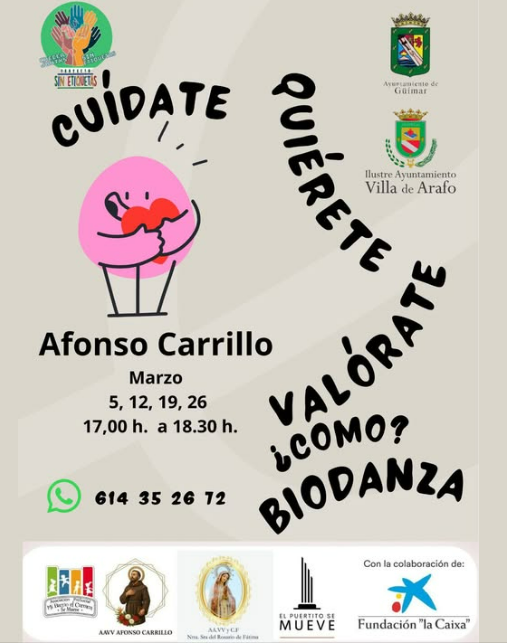 Arafo, a 05 de marzo de 2026.- Las asociaciones vecinales de la comarca han unido fuerzas para promover el bienestar emocional y físico de los vecinos y vecinas a través de una iniciativa que pone el foco en la autoestima y el autocuidado. Bajo el lema «¡Cuídate, quiérete, valórate!» , el proyecto Crecer Juntos Sin Etiquetas lanza un taller de Biodanza en el núcleo de Afonso Carrillo, un espacio pensado para conectar con uno mismo, liberar emociones y fortalecer la autoestima en un ambiente de respeto y cariño.