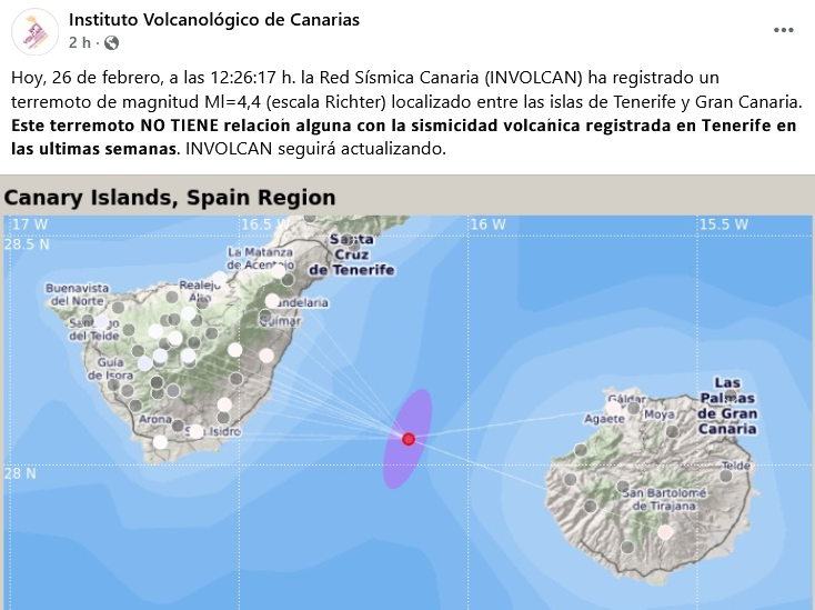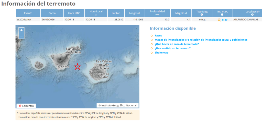 Candelaria, a 26 de febrero de 2026.- Un terremoto de magnitud 4,1 ha sacudido este jueves a las 12:26 horas varios municipios de Tenerife y Gran Canaria, según ha confirmado el Instituto Geográfico Nacional (IGN) . El seísmo, que los científicos han desvinculado tajantemente del reciente incremento de actividad en Las Cañadas del Teide, ha sido sentido con especial intensidad en los municipios del Valle de Güímar, así como en otras localidades de la vertiente norte de Tenerife e incluso en la isla de Gran Canaria .